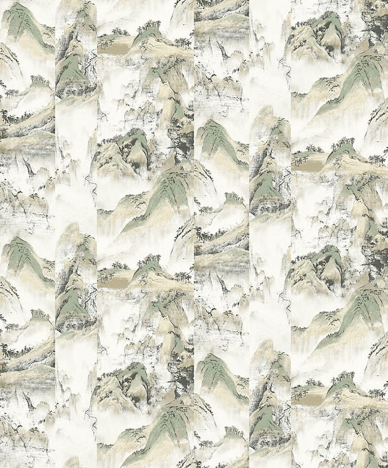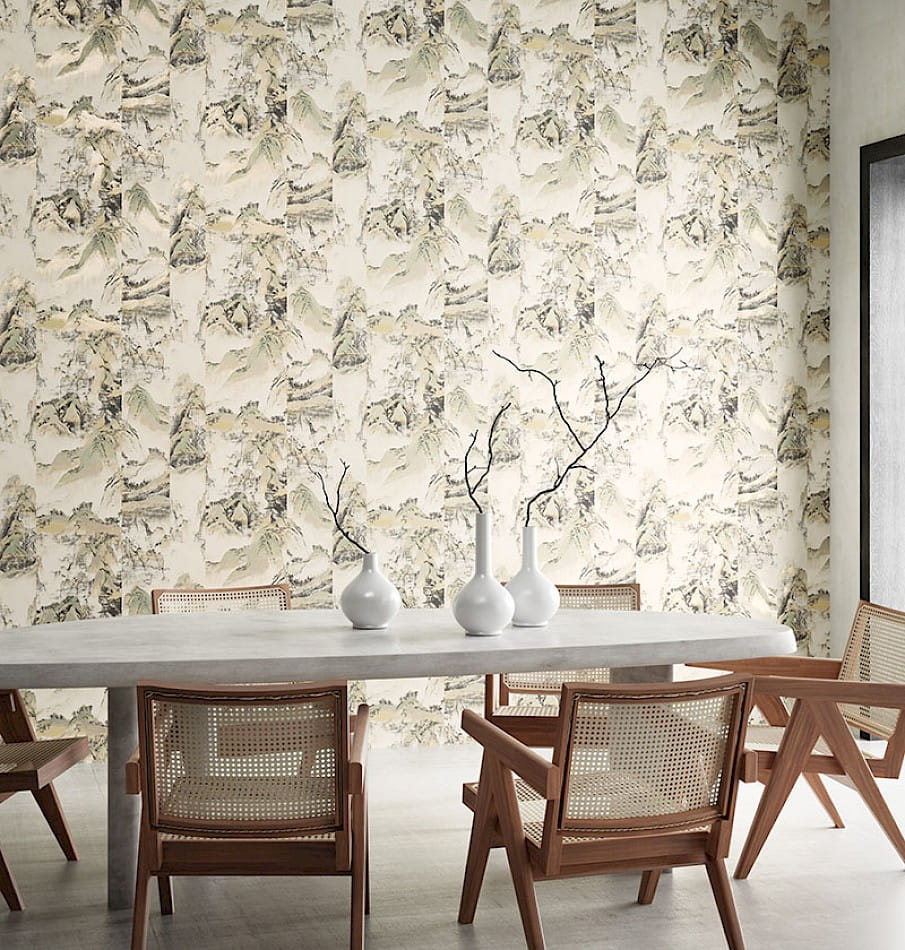 Wysokiej jakości tapeta ścienna ze wzorem inspirowanym kulturą azjatycką w nowoczesnym wydaniu. Abstrakcyjne wzory górskich szczytów naniesione są na przesuniętych względem siebie pasach, co nadaje całości efekt przestrzenny.