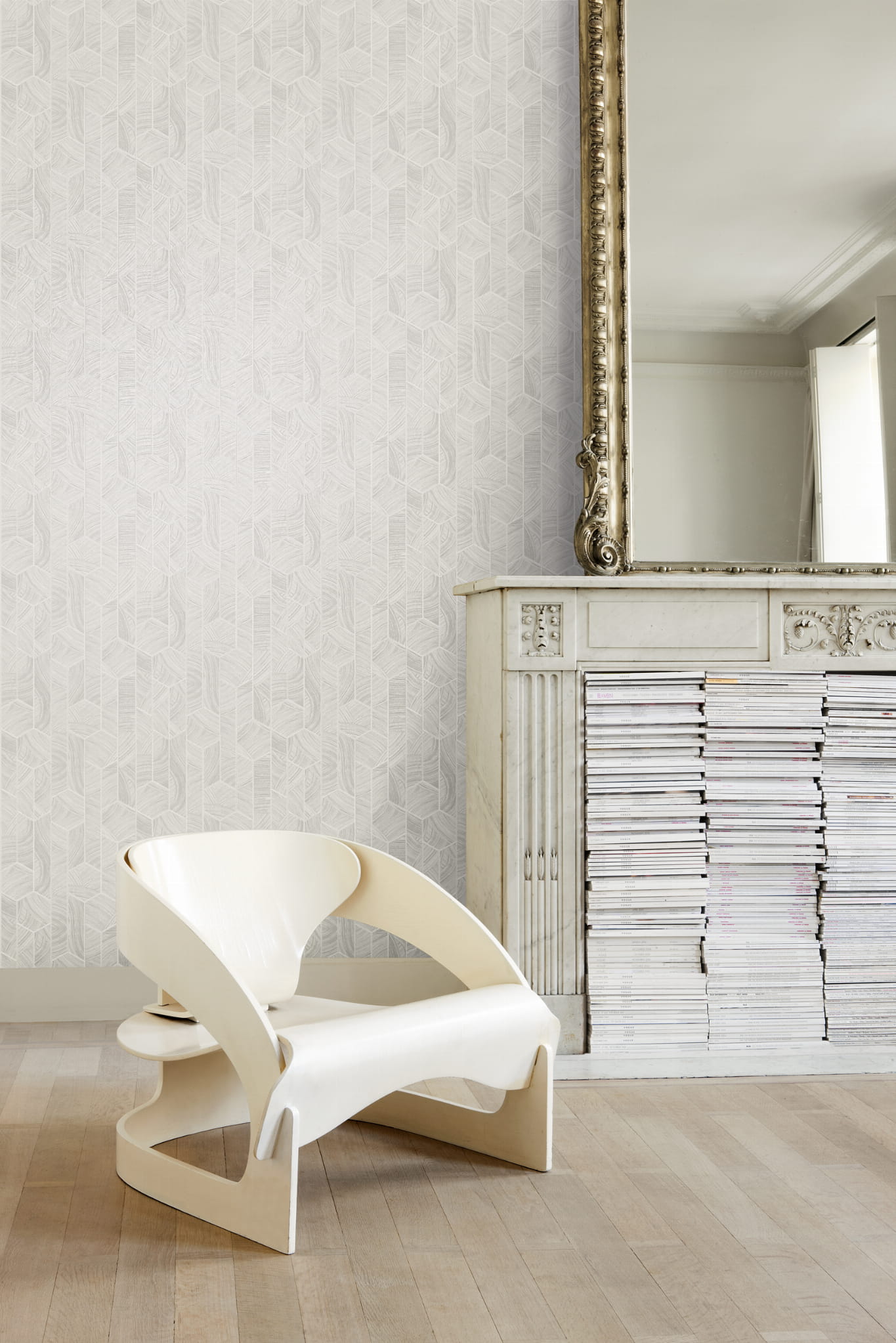 Nowoczesna tapeta ścienna, na której geometryczny wzór zestawiono z tłem przypominającym maźnięcia pędzla.