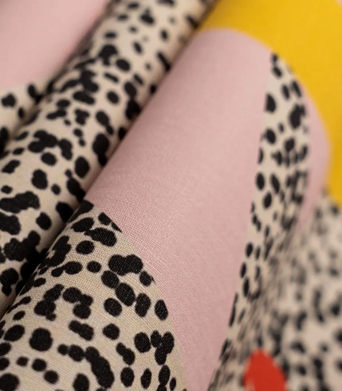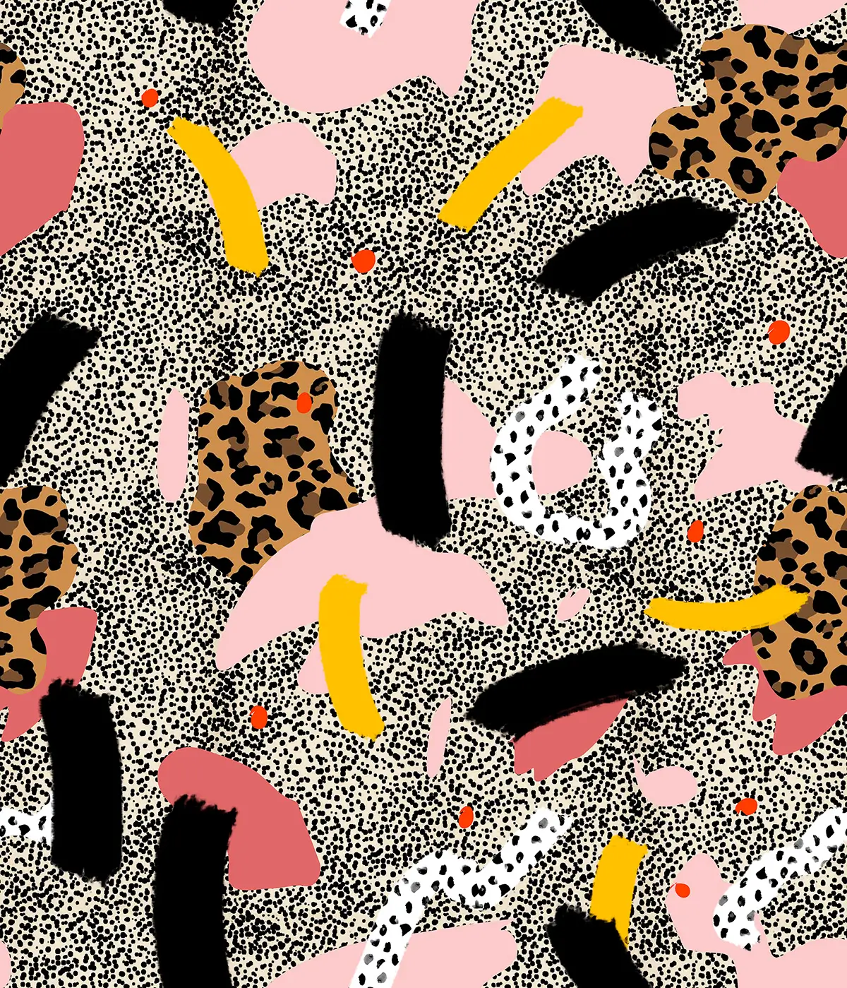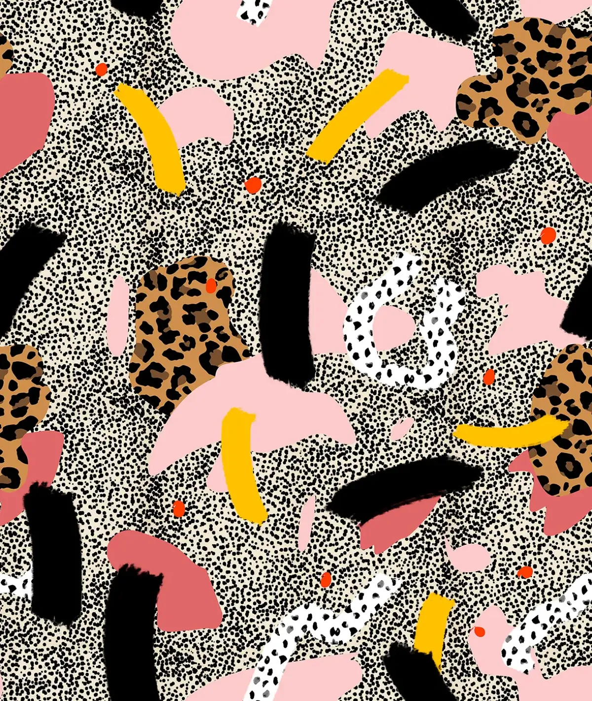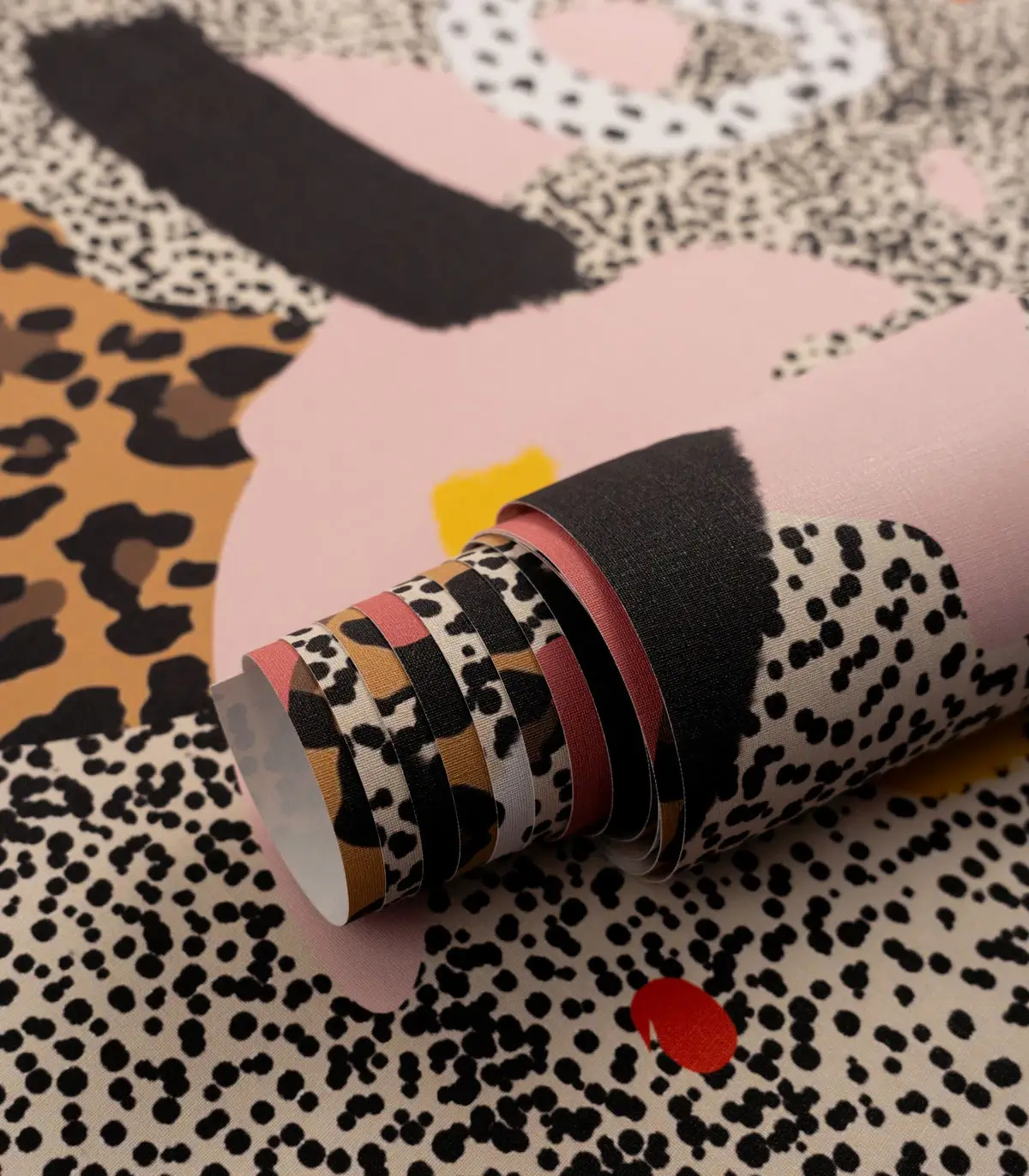 Energiczna tapeta w nowoczesnej stylistyce, łączącej nieregularne kolorowe plamy i kropki z elementami zwierzęcej panterki. Wykonana jest z trwałego materiału, łatwa w montażu, odporna na codzienne użytkowanie i starannie wykończona.