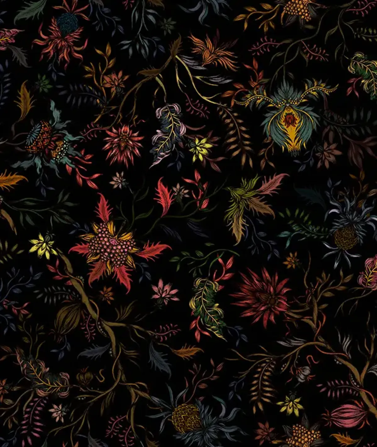 Tapeta z subtelnym, wielobarwnym wzorem roślinnym zestawionym z ciemnym tłem. Nastrojowa kolorystyka i artystyczny układ kwiatów nadają całości wyrafinowany, dekoracyjny charakter. Tapeta wykonana jest z wysokiej jakości materiału, cechuje się trwałością, łatwym montażem i starannym wykończeniem.