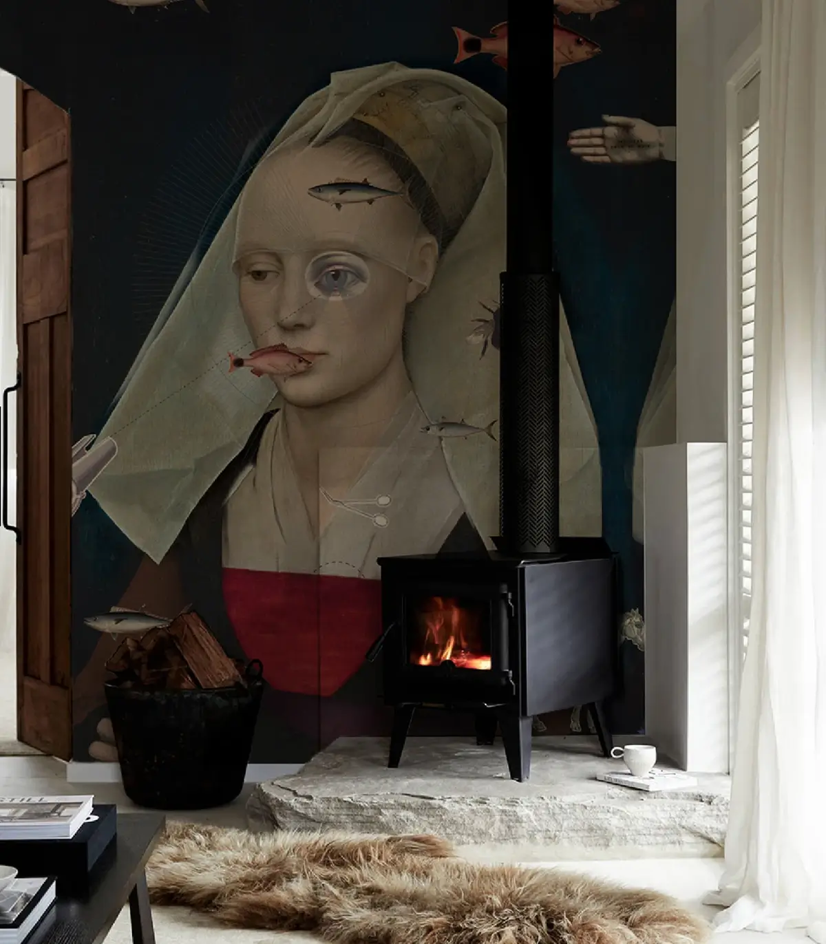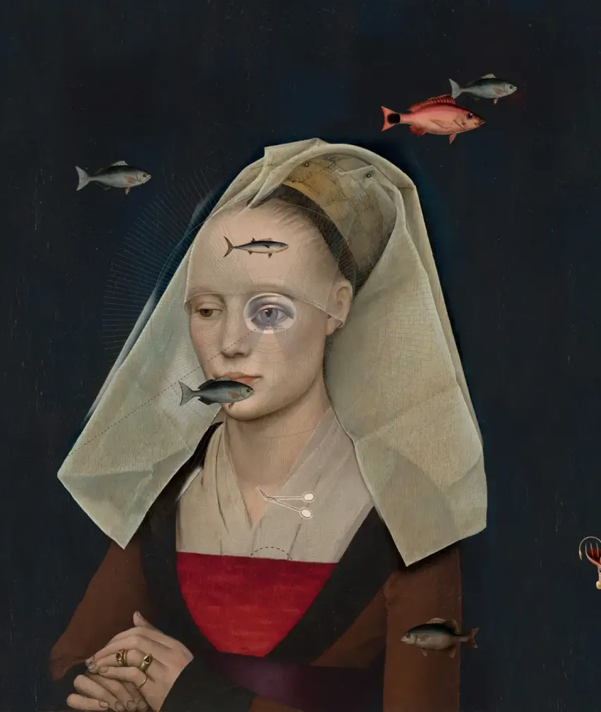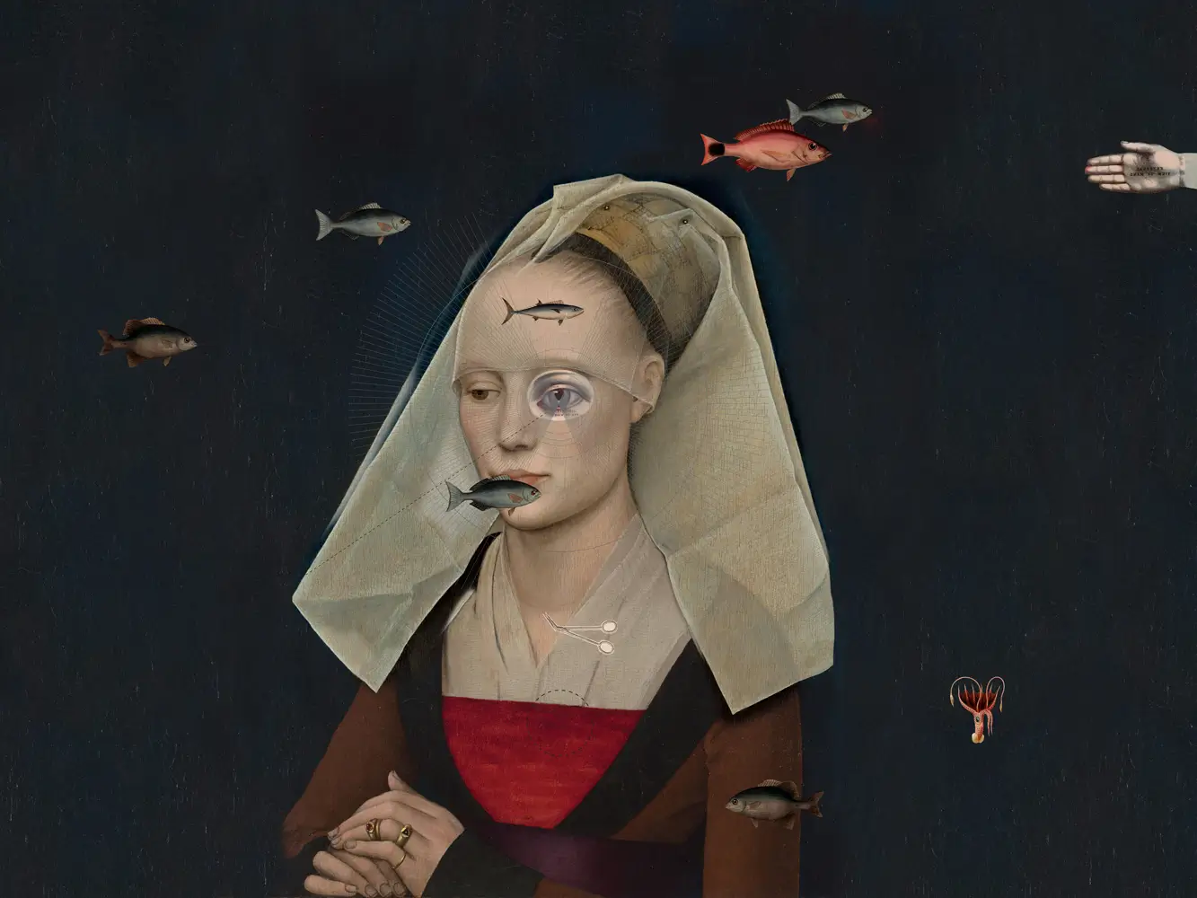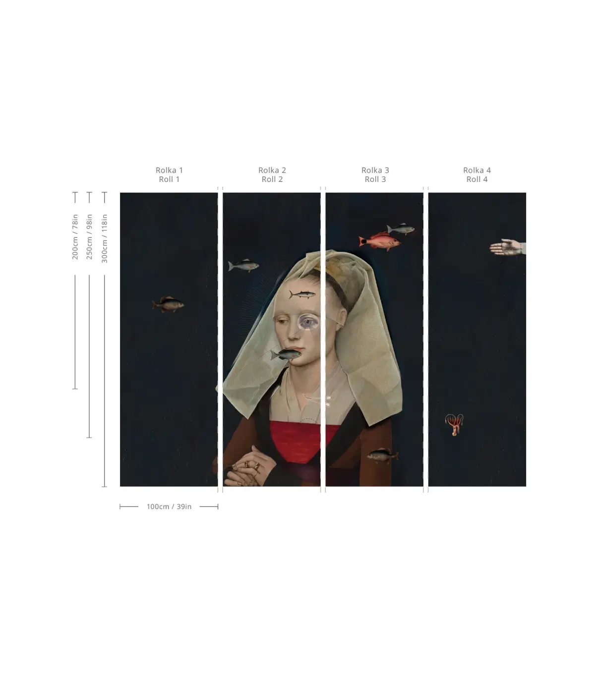 Surrealistyczna, przyciągająca wzrok tapeta muralowa z renesansowym portretem renesansowej damy zestawionej z nowoczesnymi wizerunkami dryfujących ryb i symbolicznych detali. Starannie dobrany materiał gwarantuje trwałość, łatwość montażu oraz eleganckie wykończenie.