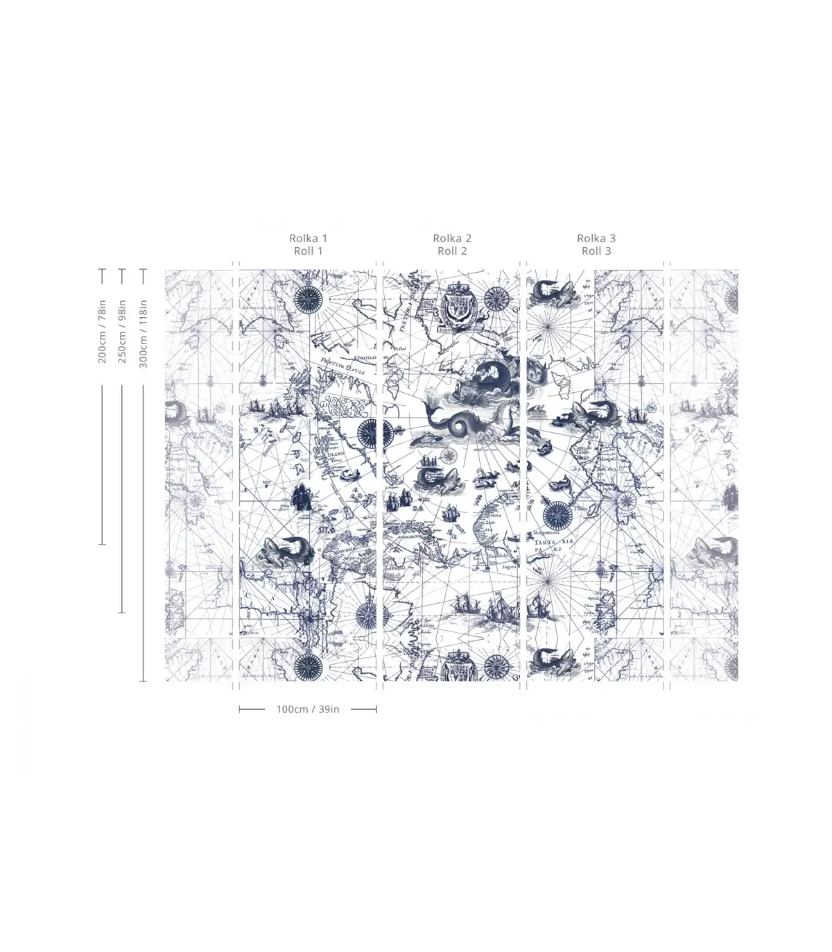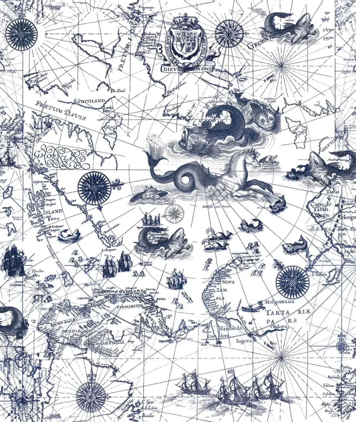 Tapeta dekoracyjna w odcieniach głębokiego granatu i bieli, łączy w sobie elegancję stylu vintage z morskimi motywami – fantastycznymi stworzeniami i wiekowymi statkami - na tle stylizowanej mapy świata. Świetnie sprawdzi się jako tapeta w stylu marynistycznym lub retro, przyciągając wzrok i pobudzając wyobraźnię każdego miłośnika podróży. Wysokiej jakości, starannie dobrany materiał gwarantuje trwałość, łatwy montaż i perfekcyjne wykończenie.