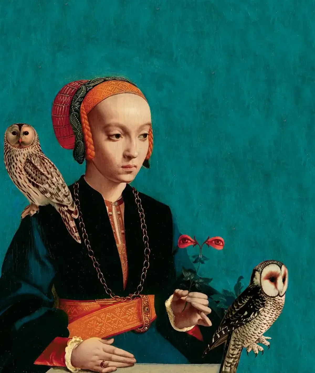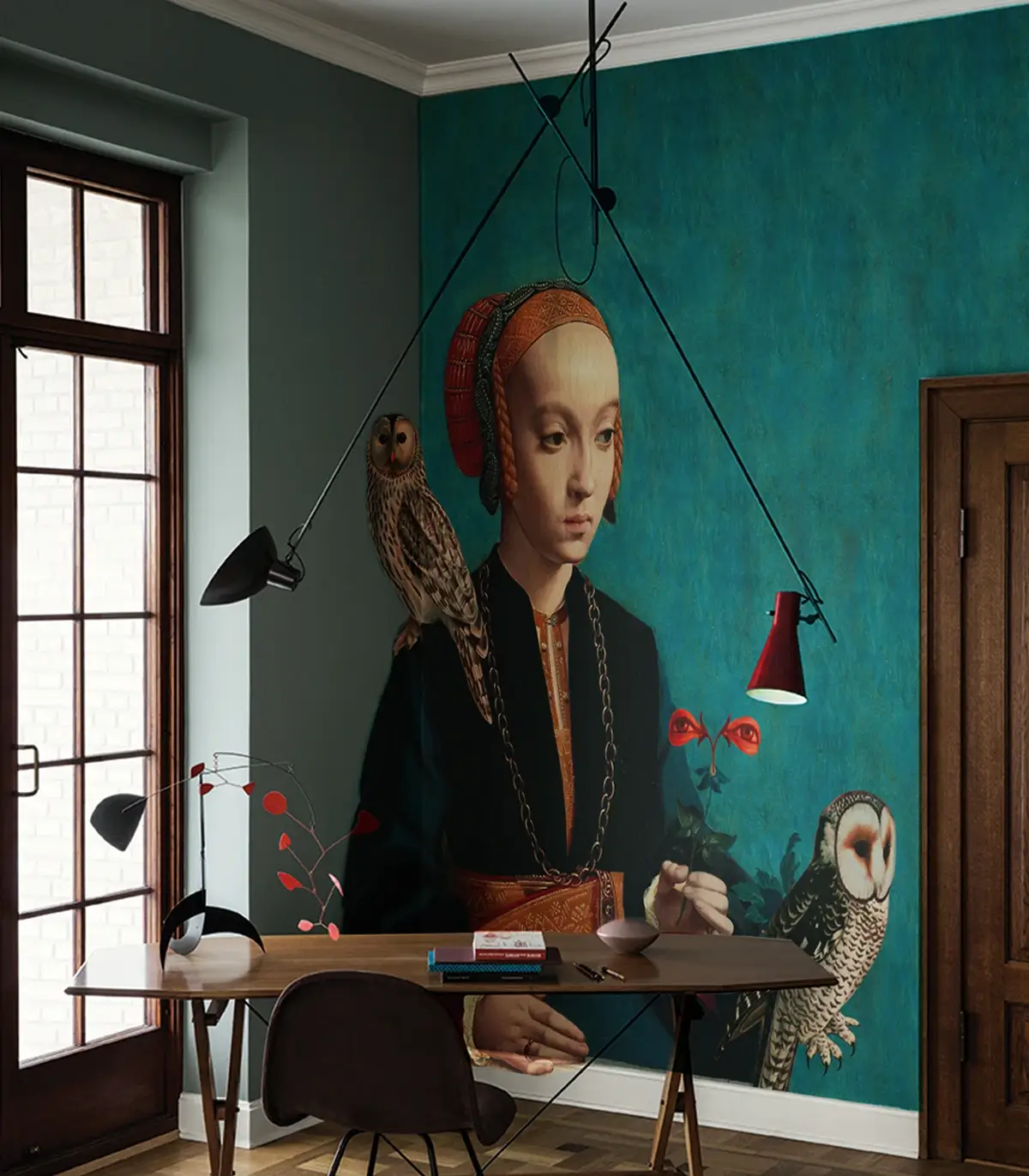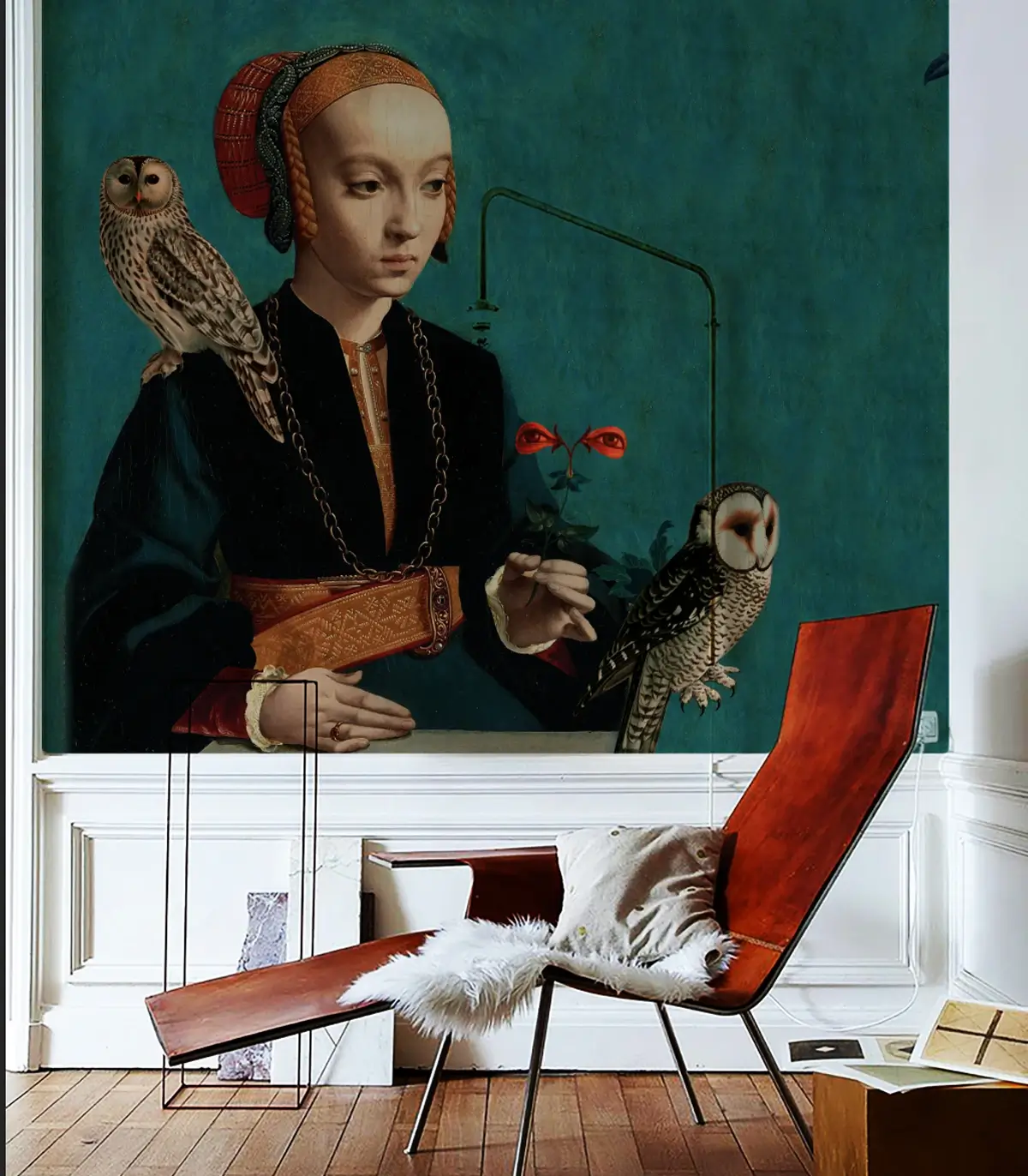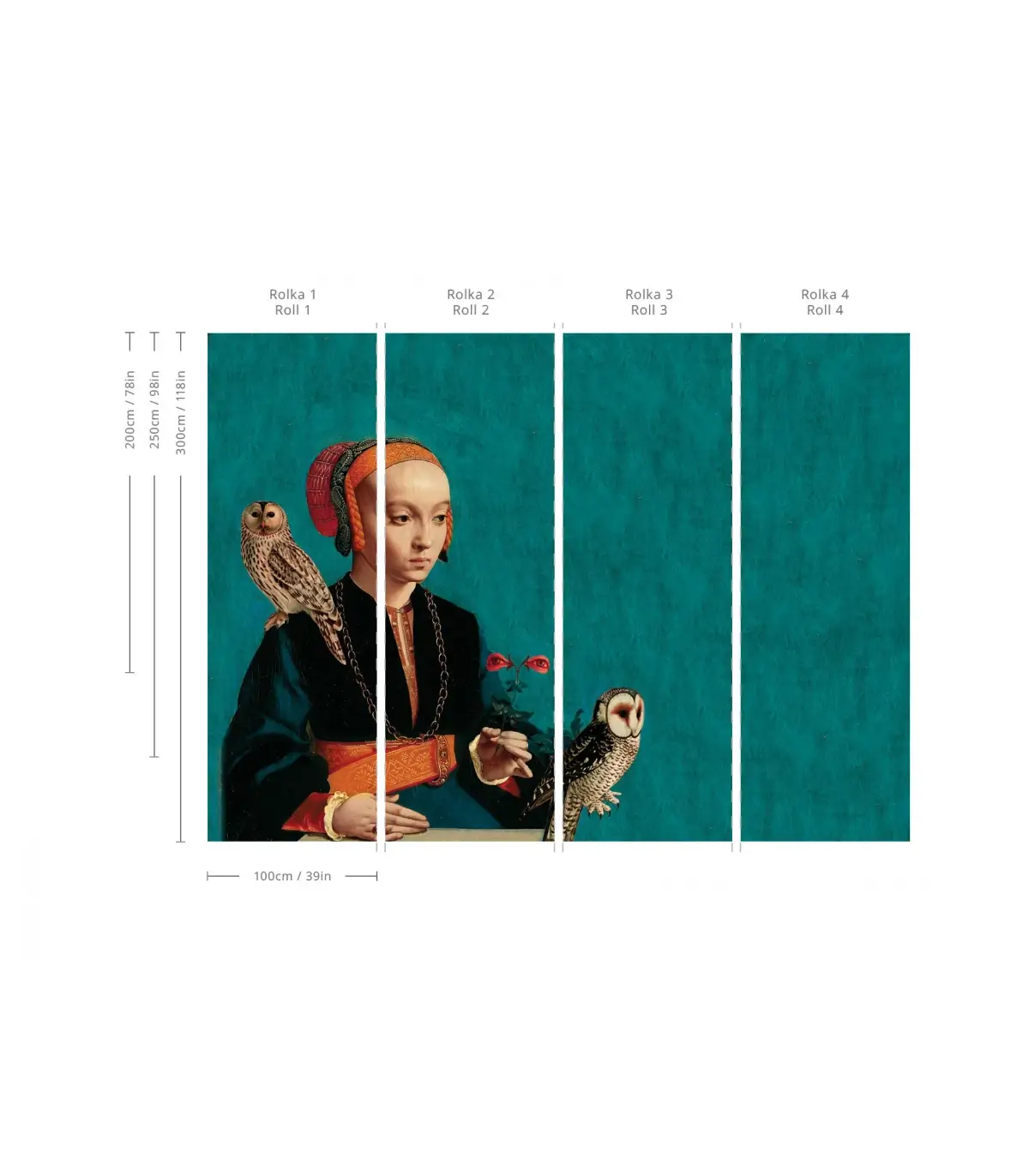 Tapeta ścienna z motywem stylizowanego portretu kobiety w renesansowym stroju, z dwoma realistycznymi sowami i turkusowym tłem, tworzy intrygujące połączenie klasyki i współczesnej estetyki. Nasycona kolorystyka i symboliczne detale tworzą wzór, który wprowadza wyrazisty akcent i pasuje do wielu typów wnętrz. Starannie dobrany materiał gwarantuje trwałość, łatwość montażu oraz eleganckie wykończenie.