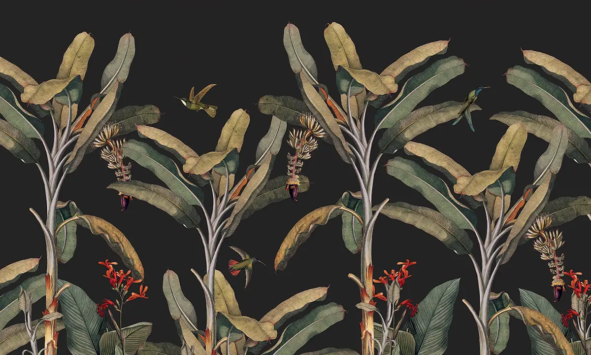 Egzotyczny mural z bananowcami na ciemnym tle Palms Wallcolors