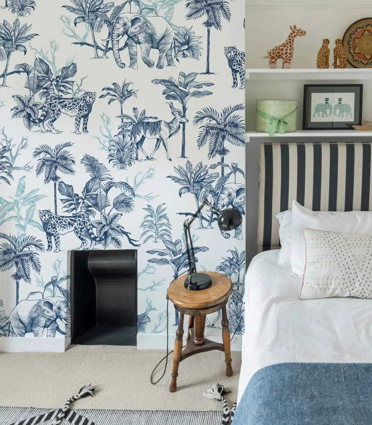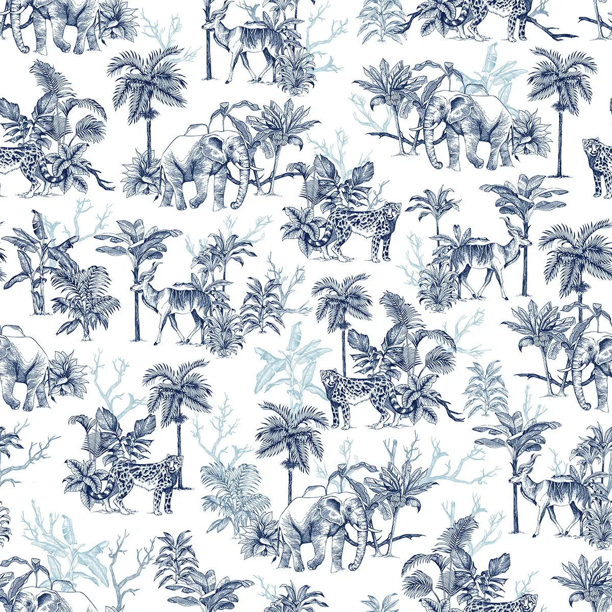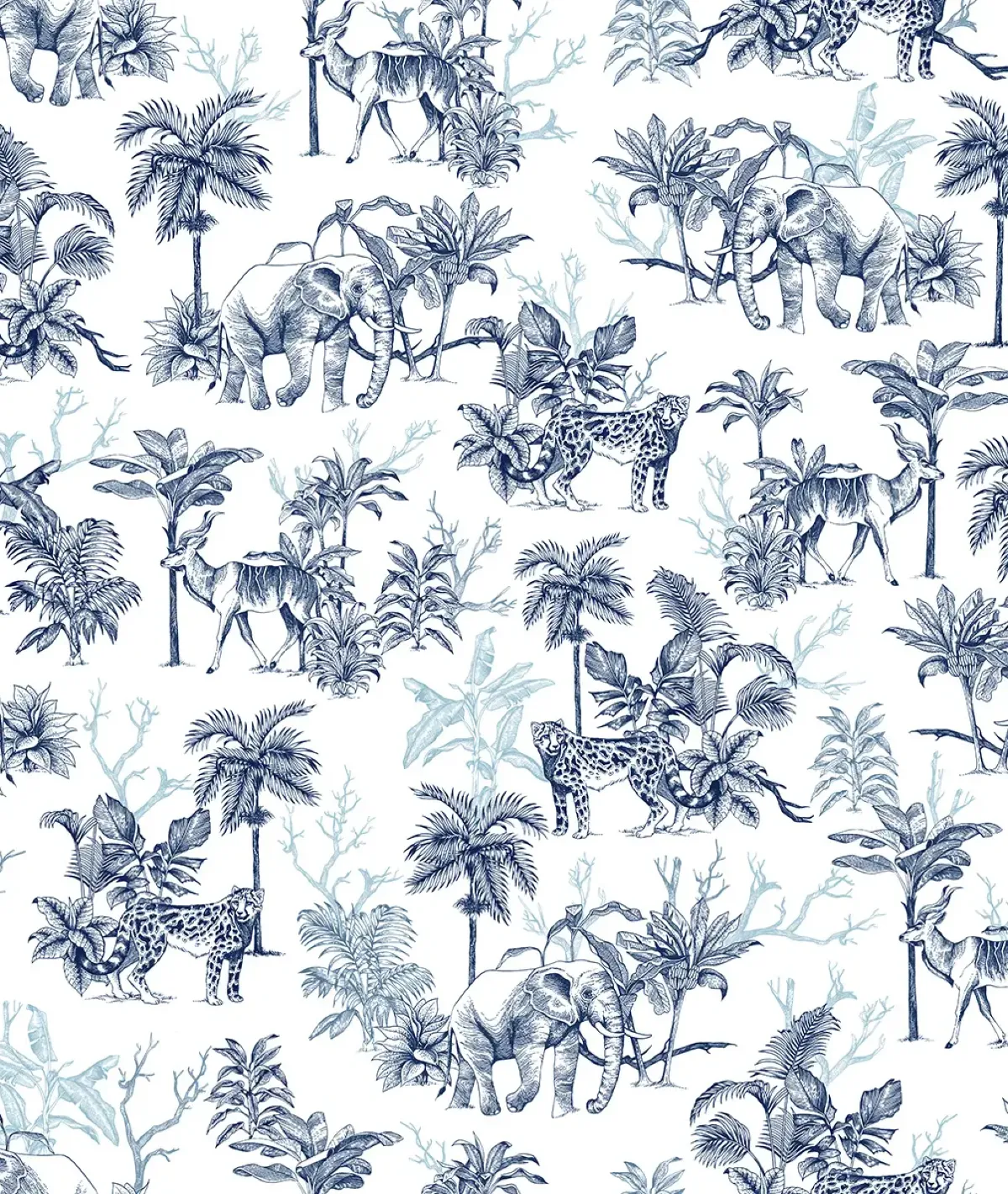 Tapeta w odcieniach granatu z motywem dzikich zwierząt i dżungli wnosi do wnętrza klimat safari. Wykonana z wysokiej jakości materiału, gwarantuje trwałość, łatwy montaż i estetyczne wykończenie.