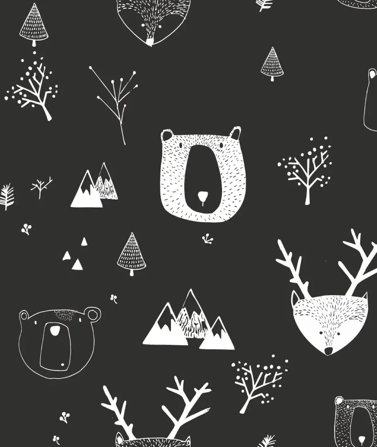 Stylowa tapeta w stylu skandynawskim do pokoju dziecka, która łączy czarne tło z delikatnymi, białymi motywami misiów, jeleni i gór. Wysokiej jakości materiał zapewnia jej trwałość, łatwy montaż oraz perfekcyjne wykończenie.