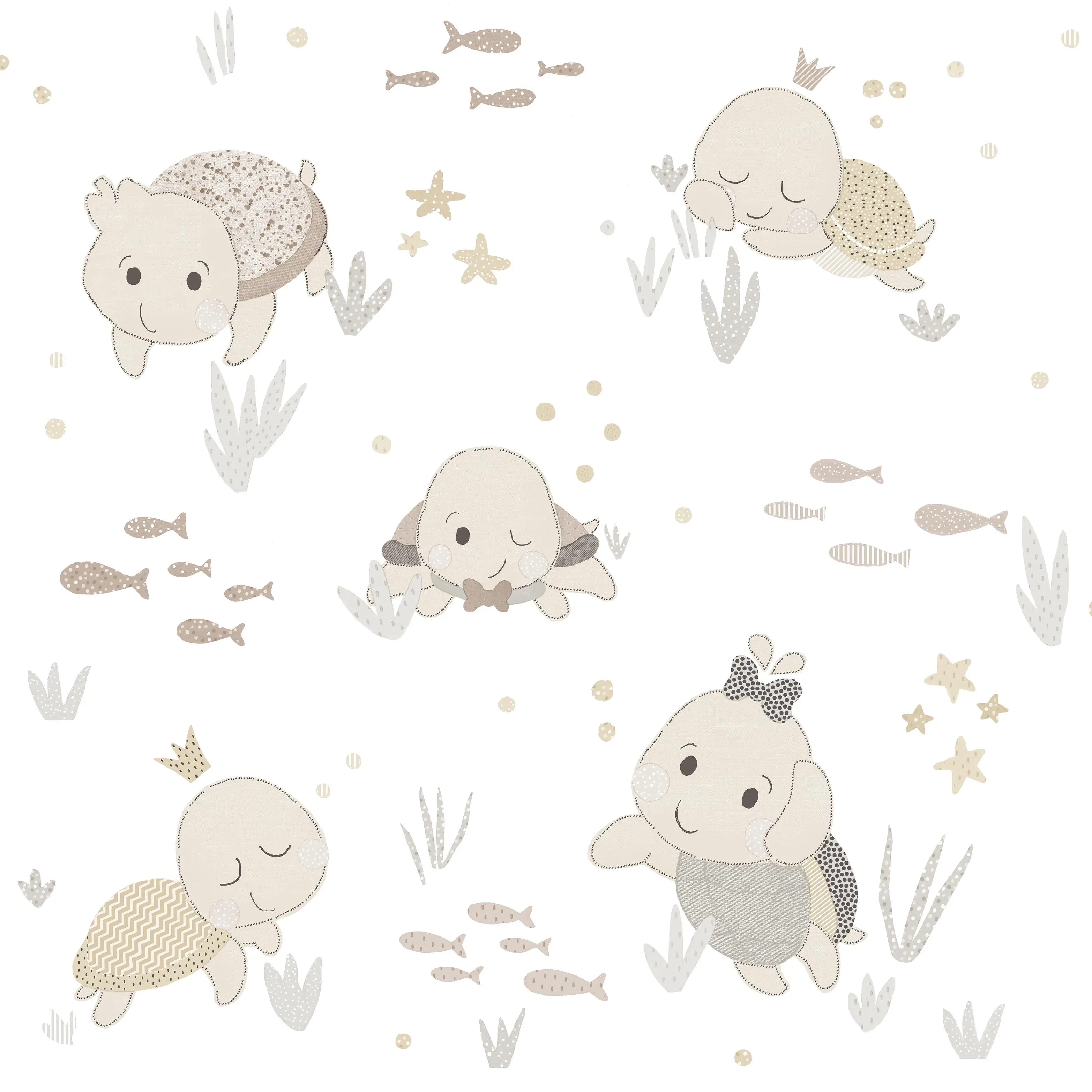Urocza tapeta ścienna z motywem małych, wesołych żółwików w pastelowych odcieniach beżu i szarości. Idealnie sprawdzi się w pokoju niemowlęcym, w przedszkolu, czy żłóbku, tworząc przytulną i pogodną atmosferę. Wzór inspirowany podwodnym światem rozwija wyobraźnię i dodaje wnętrzu bajkowego uroku.