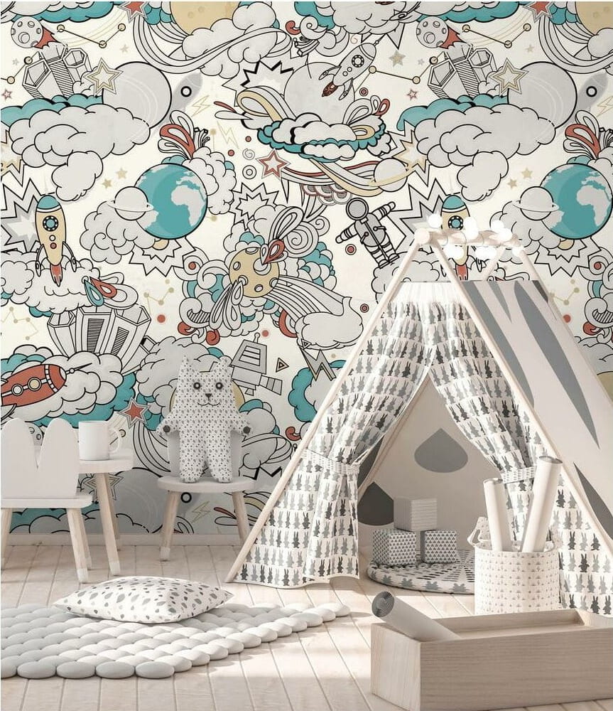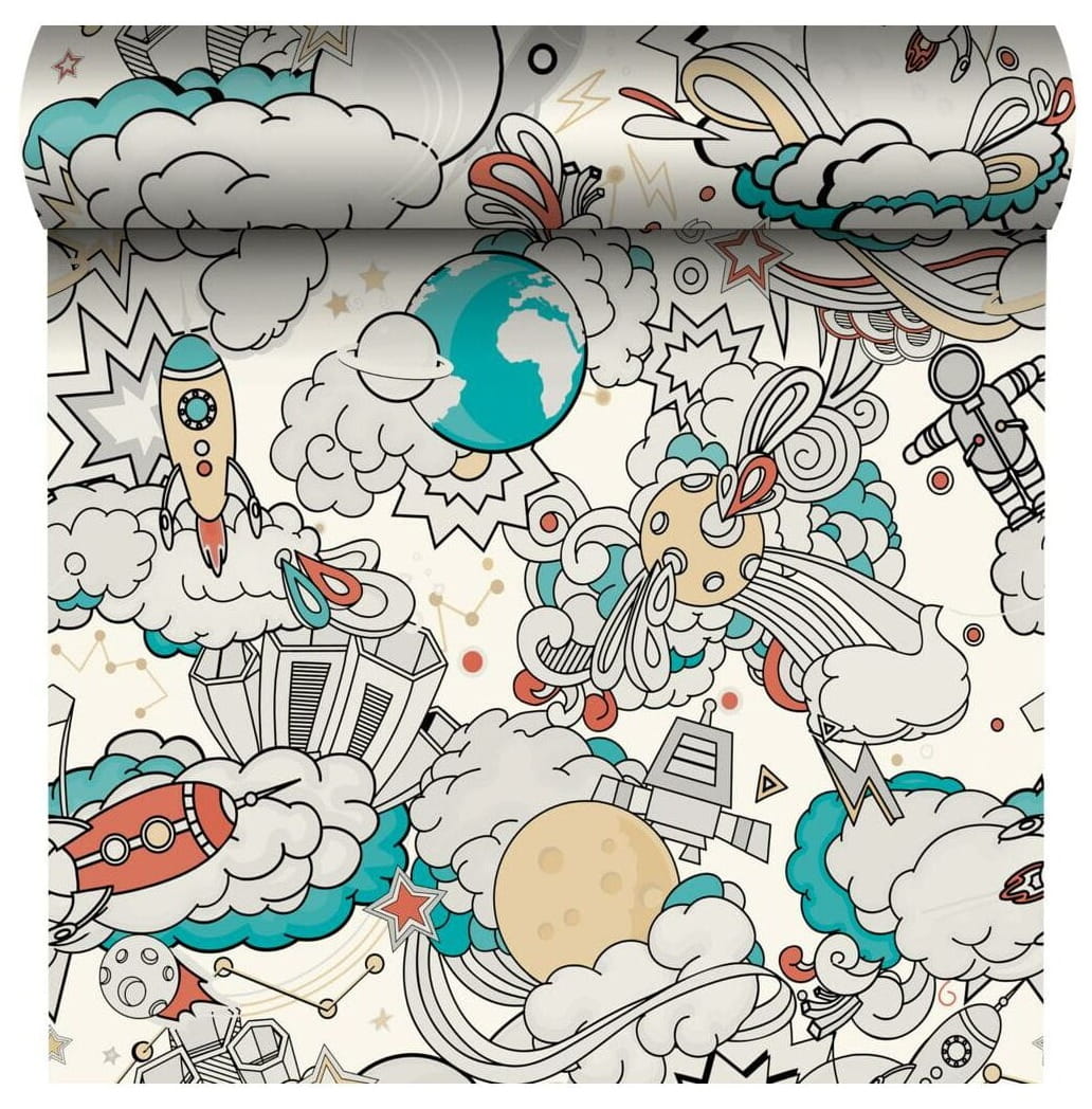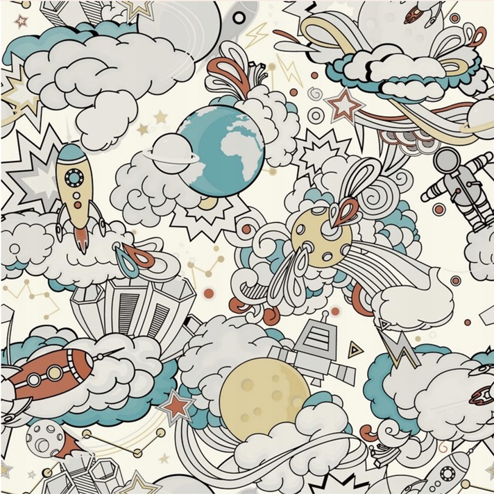 Winylowa tapeta dla dzieci, która szczególnie spodoba się miłośnikom kosmosu, rakiet i planet. Zawiera nietuzinkowy wzór w stylu komiksowym. Faktura tapety jest delikatna i przypomina płótno.