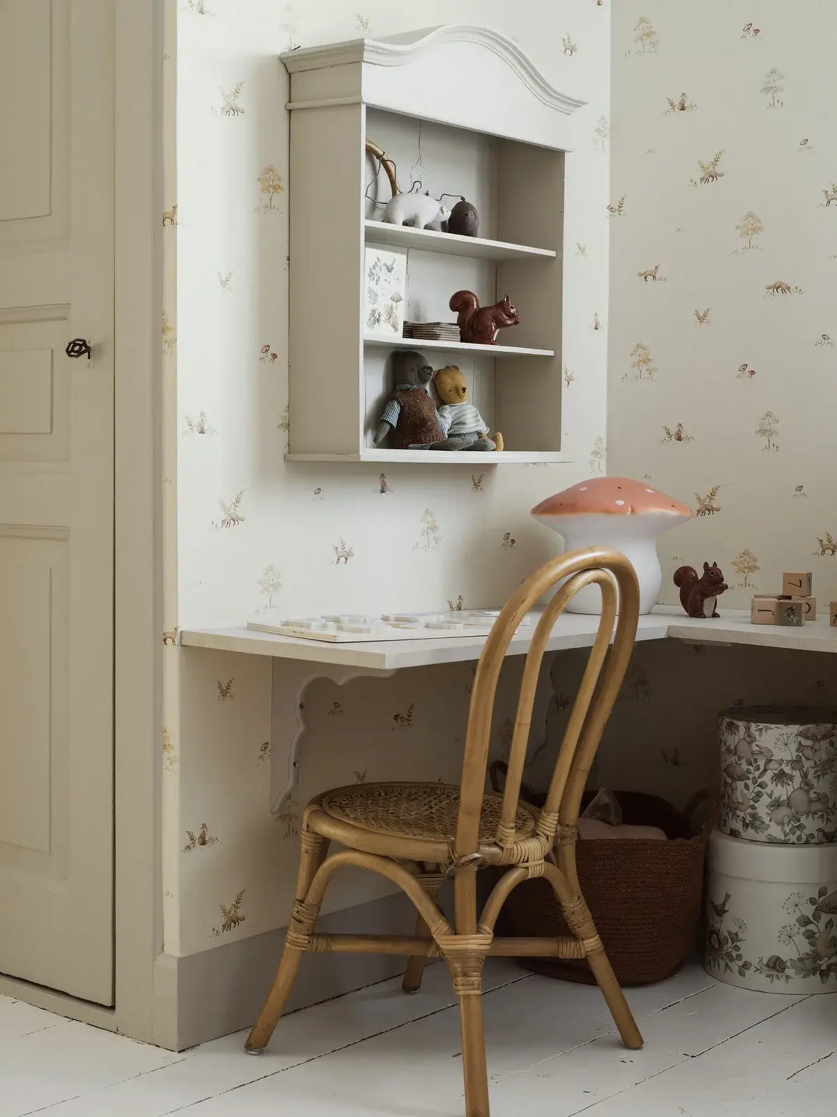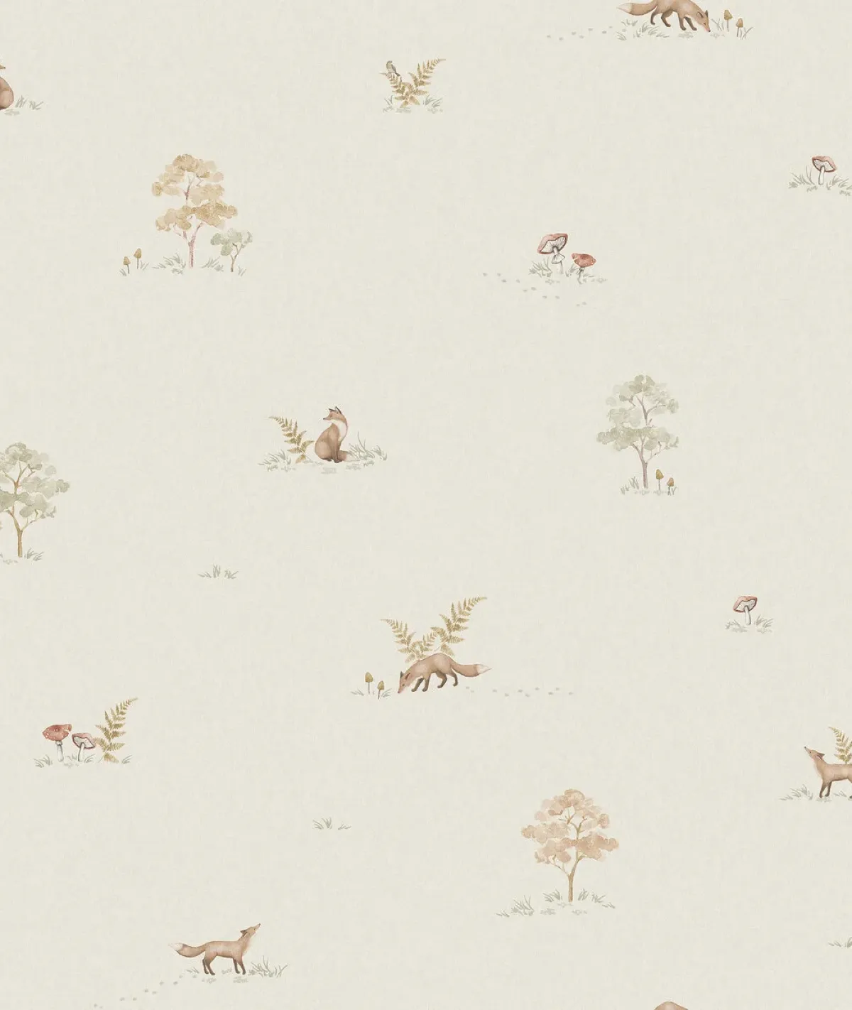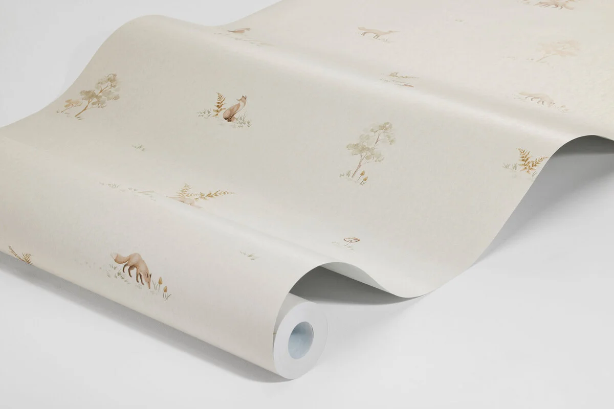 Delikatna tapeta dla dzieci, z beżowo-lnianym tłem i wzorem uroczych lisków odkrywających leśny świat, wśród paproci i grzybów. Świetnie sprawdzi się w dziecięcym pokoju, ale również w przestrzeni inspirowanej stylem skandynawskim czy leśnym.
