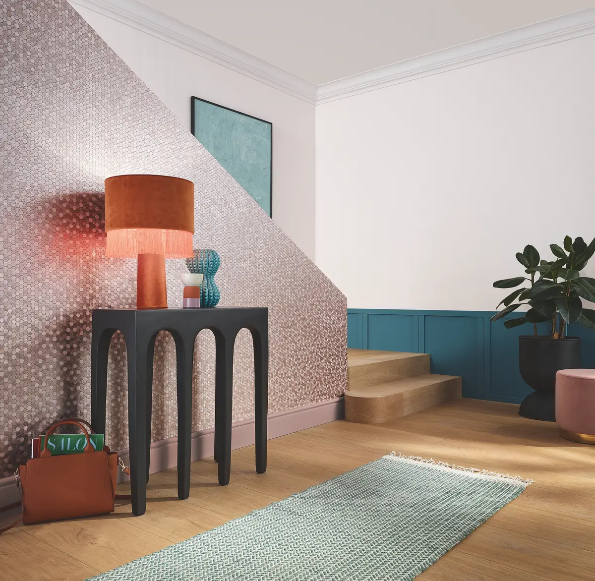 → Przestrzeń komercyjna: Tapeta geometryczna heksagony z kolekcji Marburg Papis Loveday Icon łączy wysoką trwałość i łatwość w utrzymaniu czystości z modnym, luksusowym wzorem, który natychmiast przyciąga wzrok i uwagę i podnosi prestiż każdego wnętrza, od butików i restauracji po eleganckie lobby i nowoczesne biura.