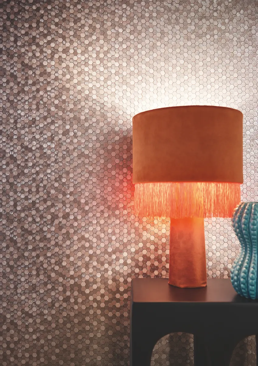 Tapeta wyróżnia się precyzyjnym, geometrycznym wzorem heksagonów z wyraźnym, metalicznym połyskiem, który subtelnie reaguje na światło i zmienia się w zależności od kąta patrzenia. Posiada tłoczoną strukturę, która nadaje jej efekt trójwymiarowości i designerski charakter. Wykonana z materiałów najwyższej jakości, jest wyjątkowo trwała, łatwa w aplikacji i dopracowana w każdym detalu.