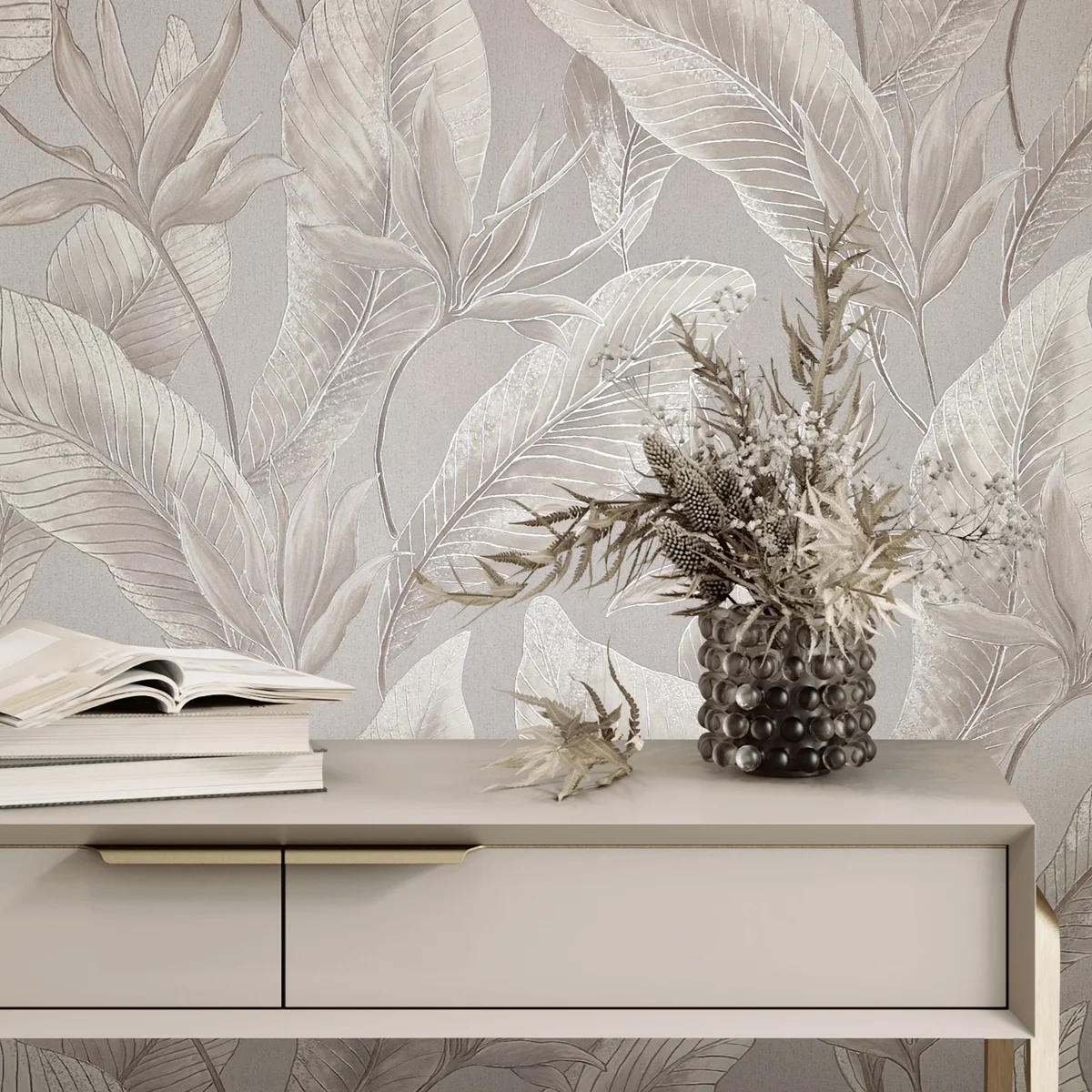 → Salon: Tapeta w liście do salonu może pełnić rolę ściany akcentowej, która przyciąga uwagę, ale nie przytłacza przestrzeni. Roślinny motyw dobrze współgra z meblami o prostych formach, tworząc spójną aranżację.