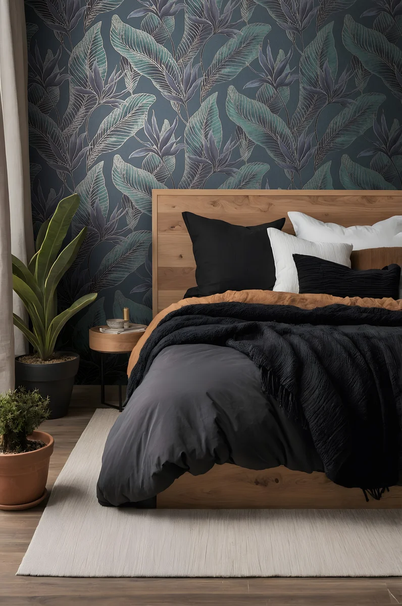 → Sypialnia, domowe strefy relaksu: W sypialni tapeta roślinna działa kojąco i sprzyja relaksowi, szczególnie gdy zastosujemy ją za zagłówkiem łóżka. Delikatny rytm liści pomaga stworzyć przytulne i wyciszające wnętrze.