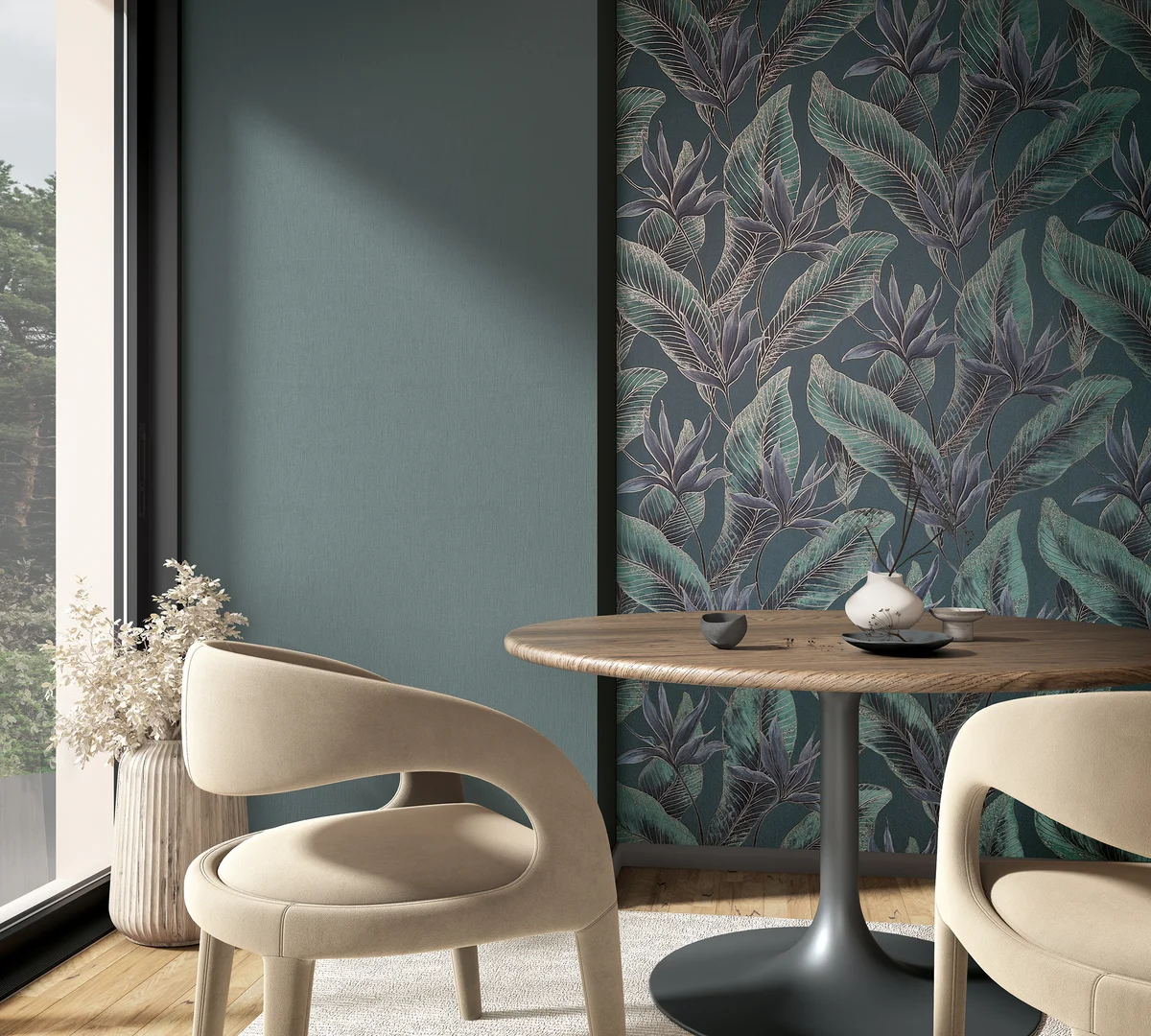 → Styl japandi: Tapeta botaniczna z dużymi liśćmi idealnie wpisuje się w estetykę łączącą minimalizm i naturę. Prosty, organiczny wzór podkreśla spokojny charakter wnętrza i współgra z naturalnymi materiałami.