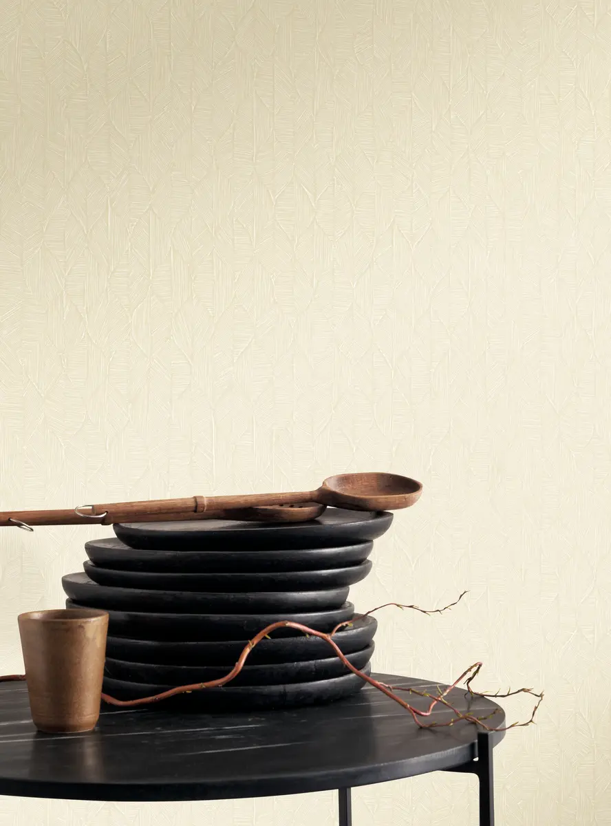 Tapeta prezentuje wzór z trójwymiarową iluzją głębi, utworzony z płasko ułożonych, regularnie rozmieszczonych elementów przypominających liście. Wyraźne użyłkowanie tworzy wielowarstwową, dekoracyjną strukturę, a zróżnicowana faktura delikatnie zmienia odcień w zależności od światła i kąta patrzenia. Wykonana jest z materiałów najwyższej jakości, wyjątkowo trwała, łatwa w aplikacji i dopracowana w każdym detalu.