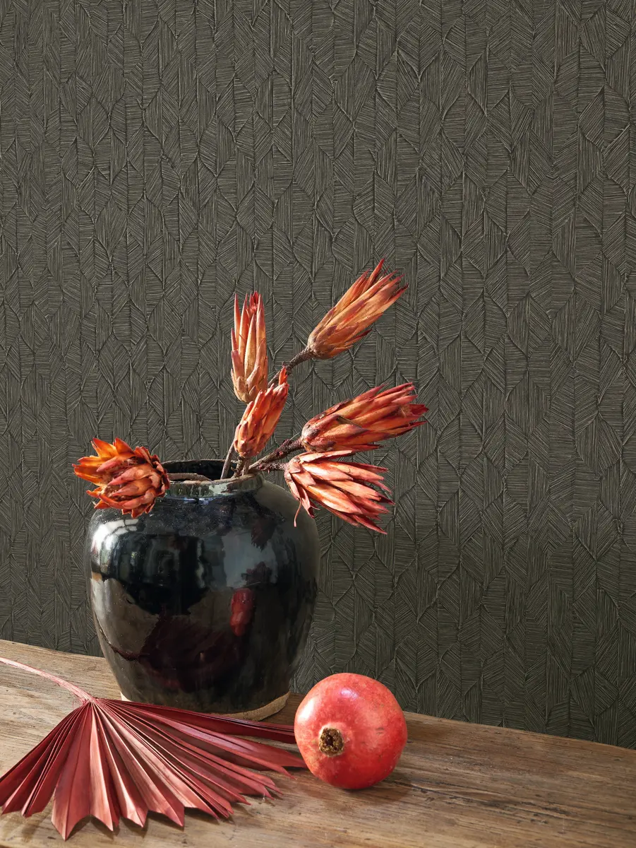 Tapeta prezentuje wzór z trójwymiarową iluzją głębi, utworzony z płasko ułożonych, regularnie rozmieszczonych elementów przypominających liście. Wyraźne użyłkowanie tworzy wielowarstwową, dekoracyjną strukturę, a zróżnicowana faktura delikatnie zmienia odcień w zależności od światła i kąta patrzenia. Wykonana jest z materiałów najwyższej jakości, wyjątkowo trwała, łatwa w aplikacji i dopracowana w każdym detalu.
