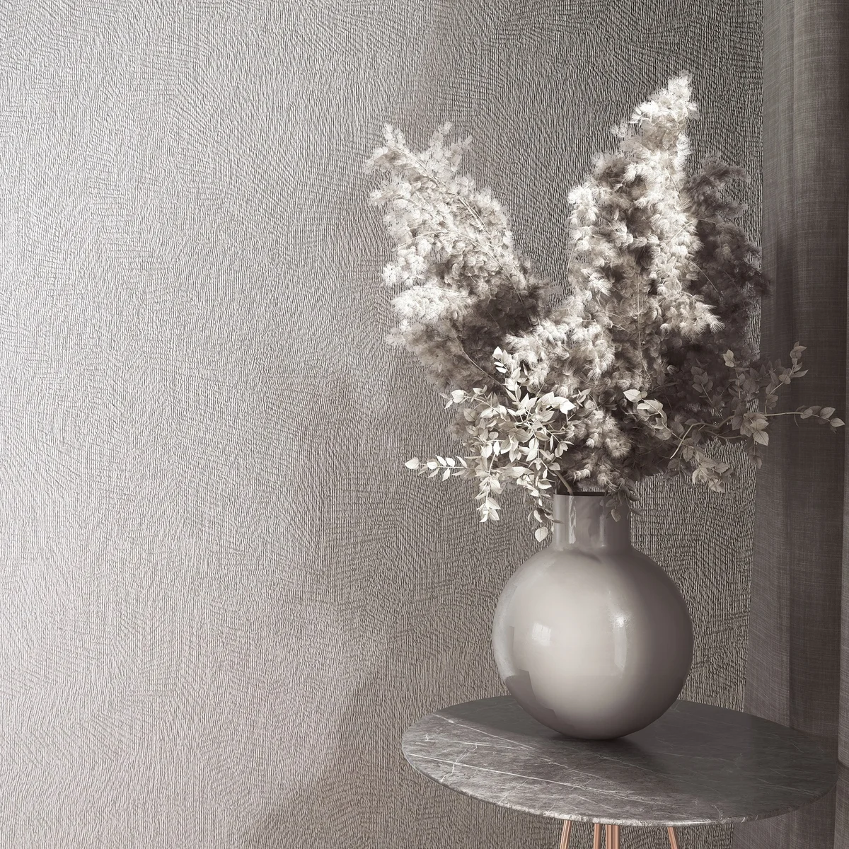 Nowoczesna tapeta strukturalna o matowym wykończeniu, z delikatnie tłoczonym wzorem inspirowanym naturą, tworzącym na ścianie subtelną grę światła i cienia. Stanowi eleganckie, spokojne tło aranżacyjne, które wprowadza do wnętrza wrażenie głębi i wyrafinowanej faktury bez dominującego wzoru.