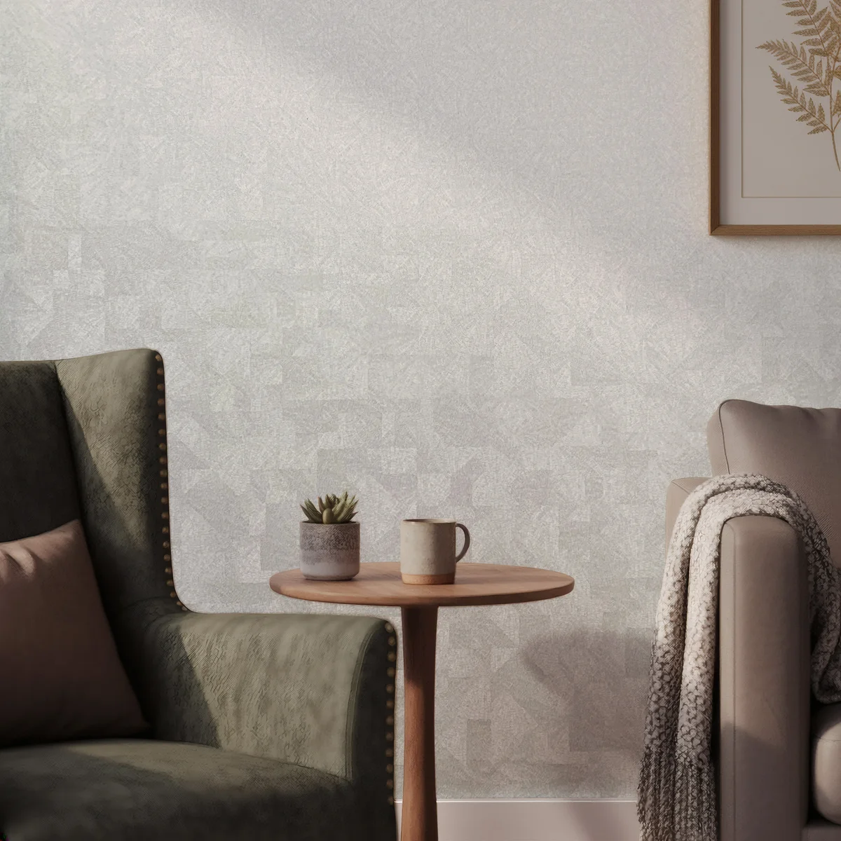 Delikatna tapeta geometryczna z efektem struktury wpisuje się w aranżacje, w których ważna jest faktura, światło oraz spokojna estetyka ściany: