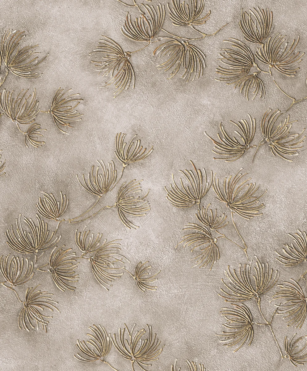 Tło tapety delikatnie nawiązuje do przecieranego tynku dekoracyjnego, który został uzupełniony subtelnym wzorem gałązek drzew iglastych o efekcie wizualnej wypukłości, dzięki czemu motyw wydaje się lekko uniesiony i bardziej przestrzenny. Tworzy to spokojną, naturalną kompozycję na ścianie i sprawia, że tapeta roślinna wprowadza do wnętrza przytulność oraz harmonijny charakter.