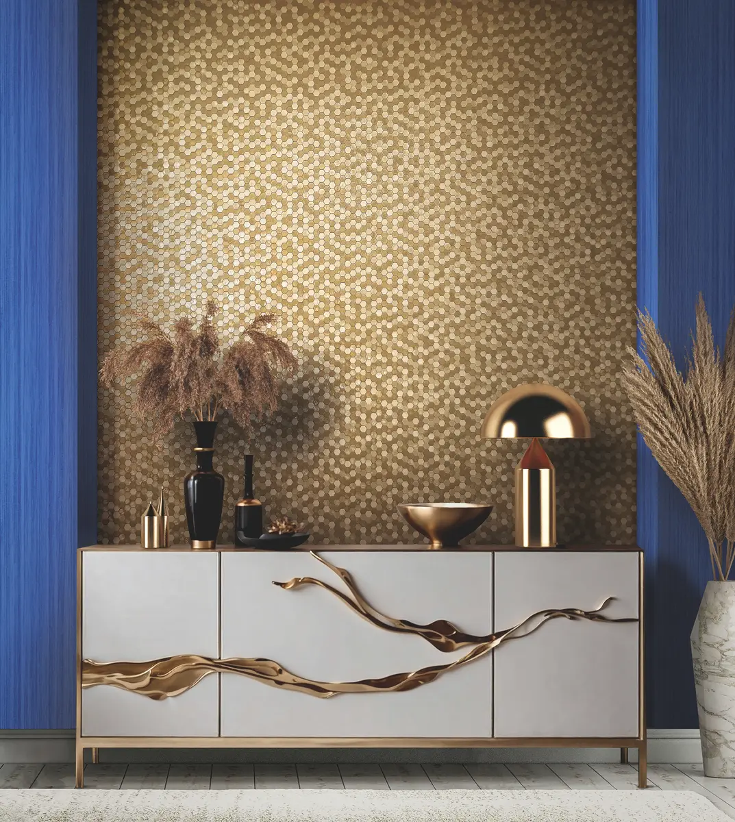 → Styl glamour: W tym przypadku, tapeta imitująca metal, to luksusowy, wyrazisty motyw, który natychmiast przyciąga uwagę i podkreśla prestiż oraz szyk wnętrza.