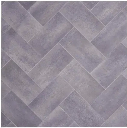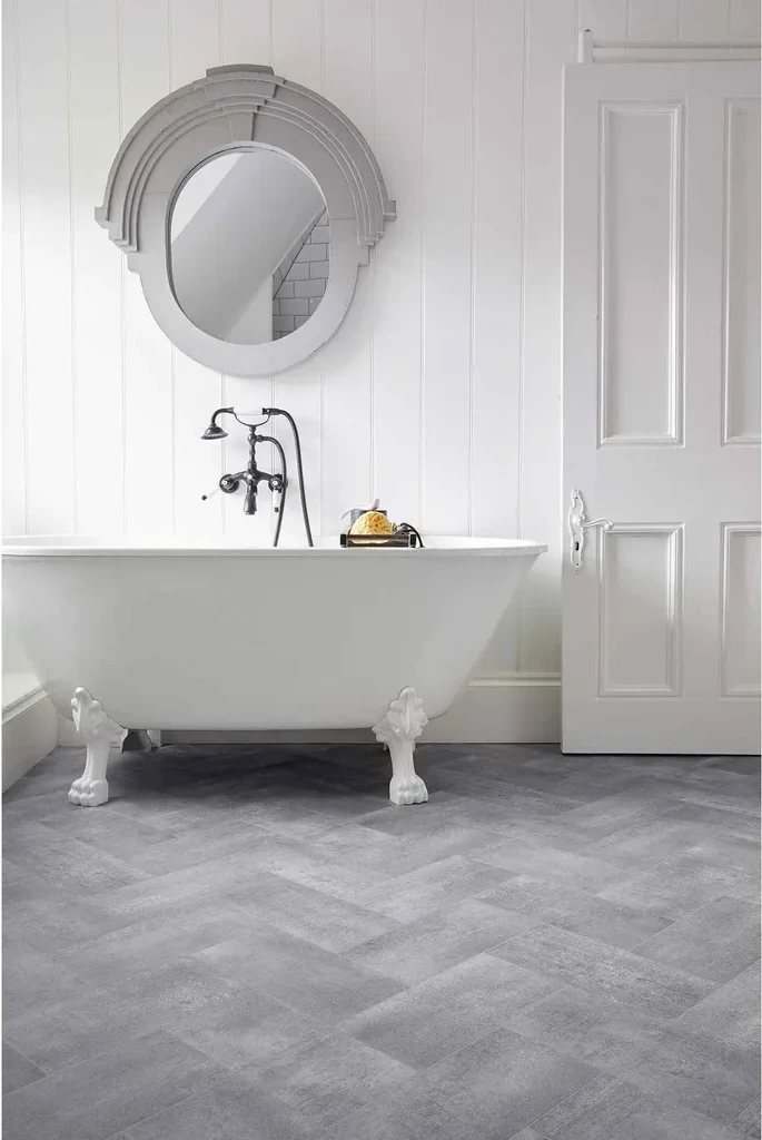 Elastyczna wykładzina w odcieniach szarości z geometrycznym wzorem płytek ułożonych ukośnie. Odporna na wilgoć, łatwa w czyszczeniu.