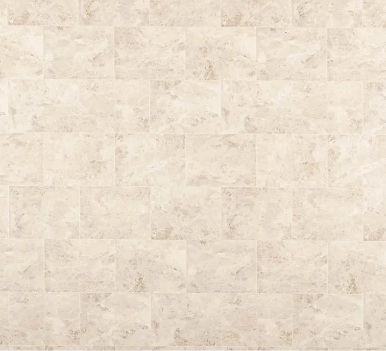 Elastyczna wykładzina w kolorze beżu z wzorem marmurowych płytek. Odporna na wilgoć, łatwa w czyszczeniu.
