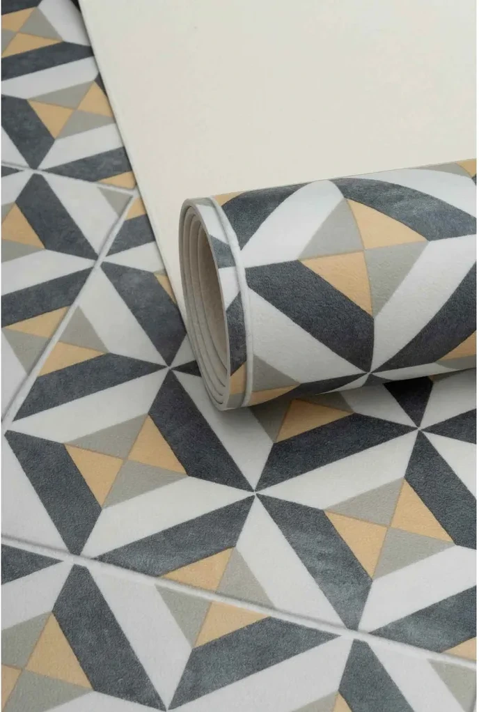 Elastyczna wykładzina wielokolorowa, geometryczna w stylu retro. Odporna na wilgoć, łatwa w czyszczeniu.